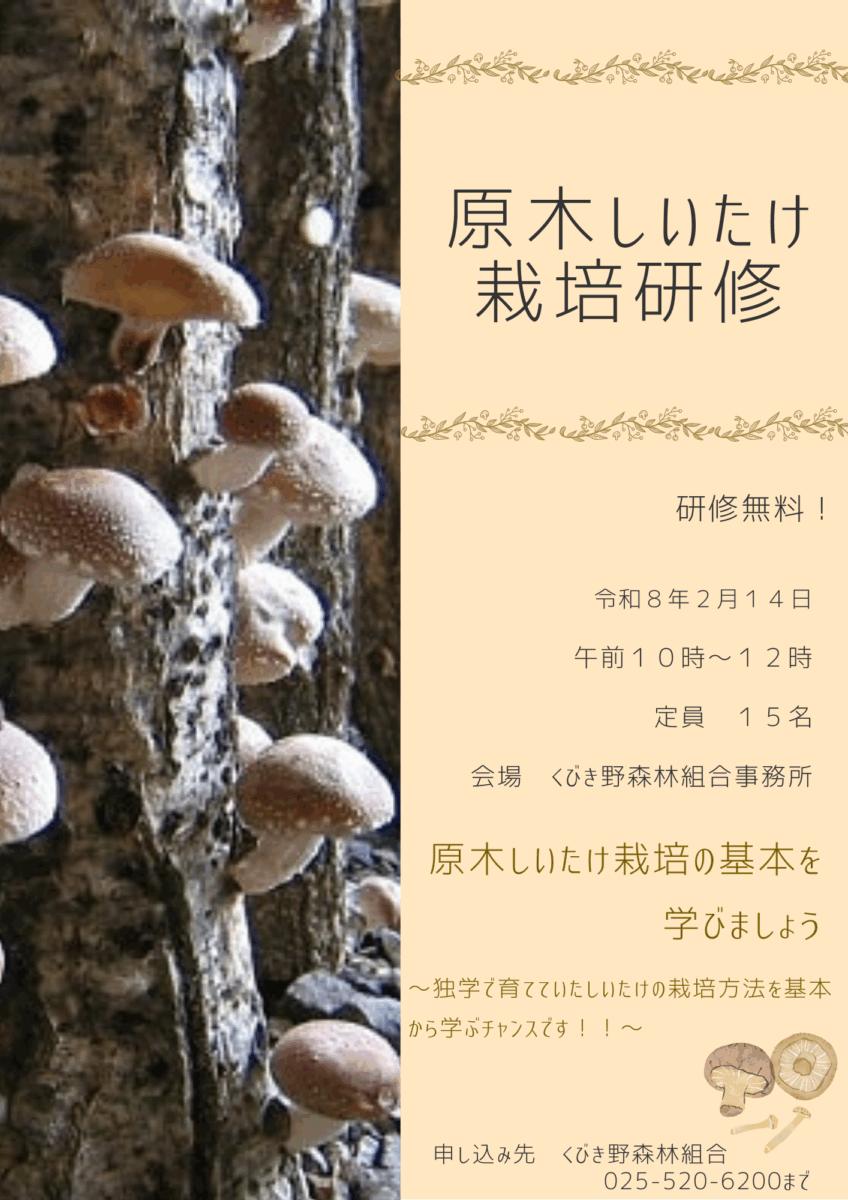 イベント 原木しいたけ栽培研修会のお知らせ 2026年2月3日 くびき野森林組合 この度、組合初となる「原木しいたけの栽培・管理研修会」を企画しました。植菌のタイミングは?、種ゴマはどの程度打てば良いの?など基本的なことについて説明します。ぜひご参加ください。