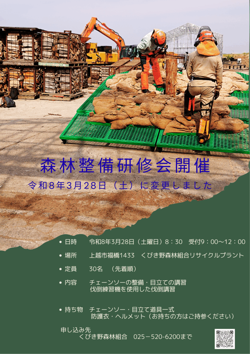 イベント 森林整備研修会(延期)の日程のお知らせ 2026年2月9日 くびき野森林組合 1/31に開催予定であった研修会ですが、大雪のため延期させていただきました。変更日は、3/28(土)です。是非ご参加ください。