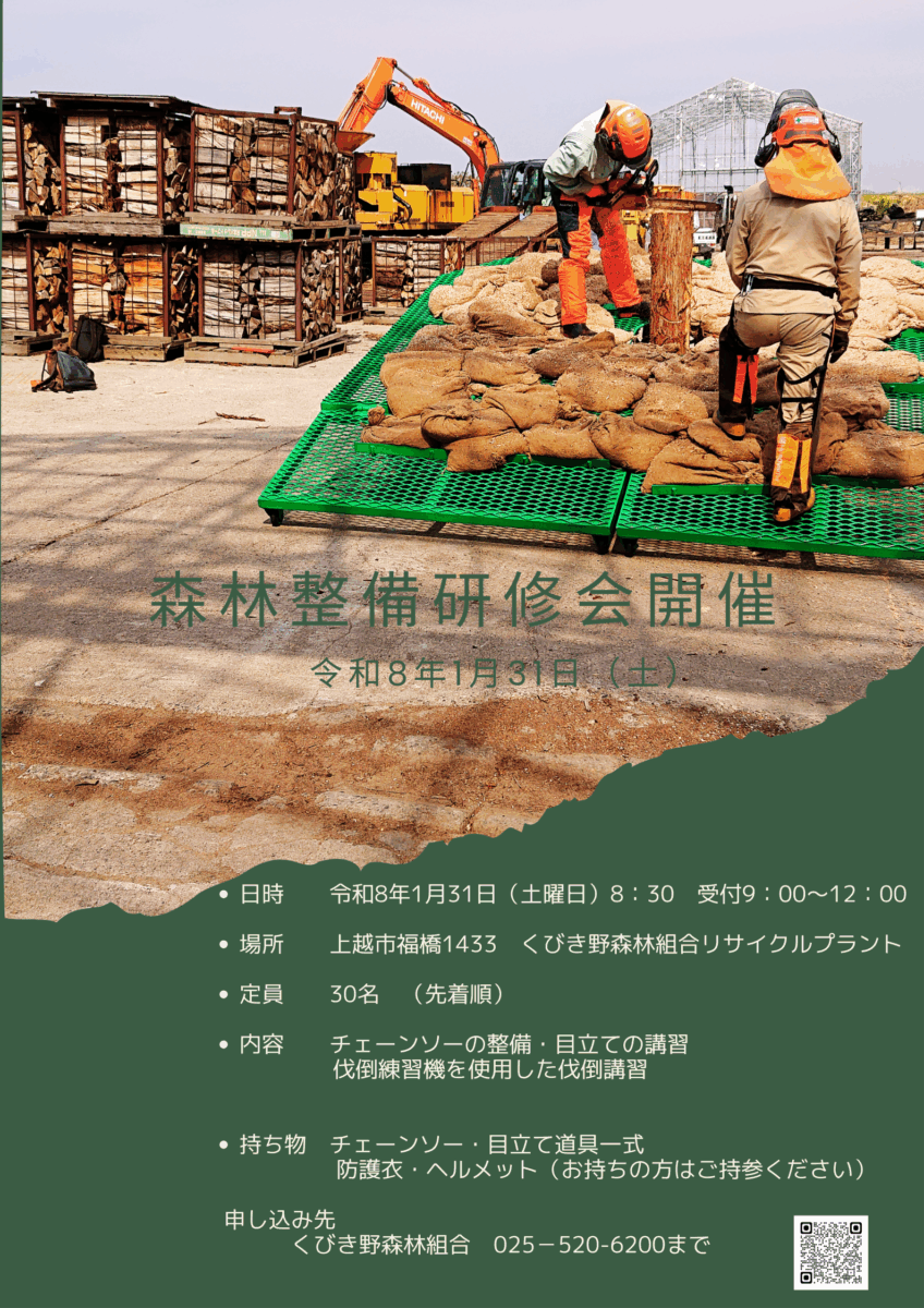 お知らせ 森林整備研修会のお知らせ 2025年12月22日 くびき野森林組合 くびき野森林組合では森林整備推進のため、林業機械整備・技術指導・視察等の研修を実施しております。今回はチェーンソーの点検・整備の研修を計画しました。ぜひご参加ください。日時:令和8年1月31日(土)、9:00-12:00場所:くびき野森林組合リサイクルプラント(上越市福橋1433)定員:30名(先着順)持ち物:チェーンソー・目立て道具一式・防護衣・ヘルメット(お持ちの方はご持参ください)申し込み:くびき野森林組合 電話:025-520-6200